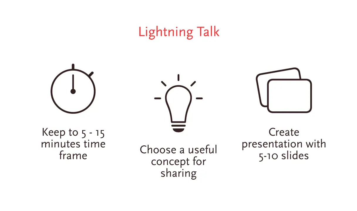 To figure out all those things, Lightning Talks are your best bet. In these sessions, people with relevant knowledge share their insights in 10–15 minutes. Even better if you prepare a presentation that covers: