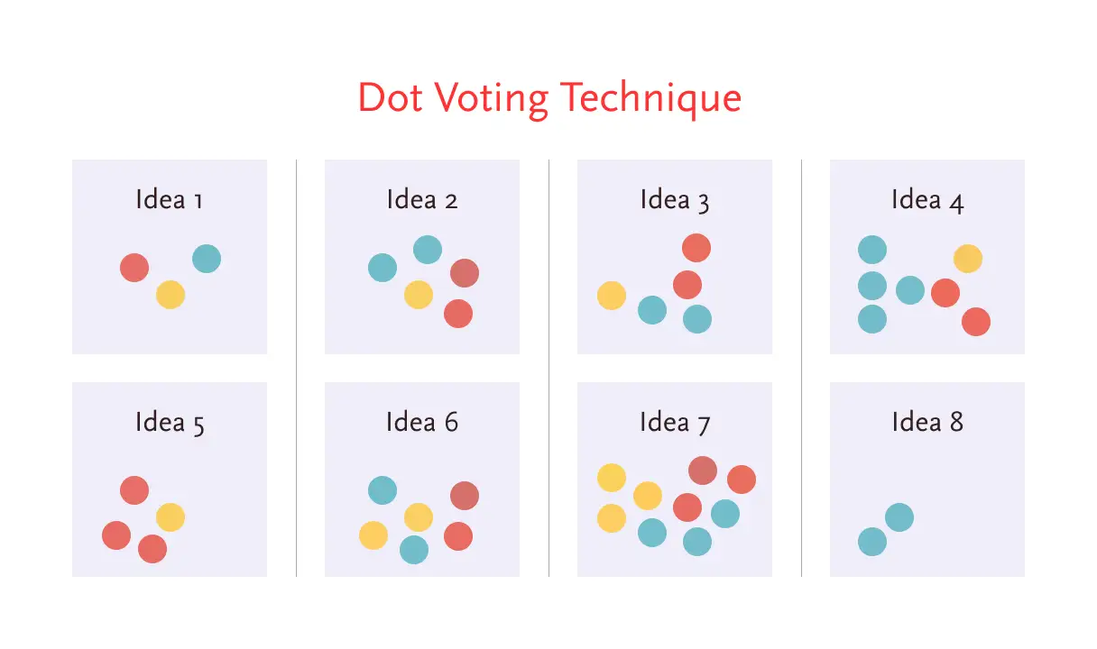 Then, everyone is invited to cast their vote. They can either use dot voting or they can simply mark a dot with a pen on the ideas they prefer. And based on the number of votes each idea receives, the team decides which ones to move forward with.